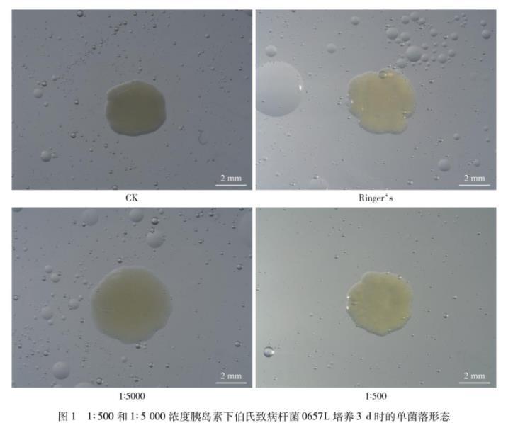 圖1 1∶500和1∶5 000濃度胰島素下伯氏致病桿菌0657L培養(yǎng)3 d時(shí)的單菌落形態(tài)