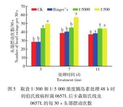 圖5取食1∶500和1∶5 000濃度胰島素處理48 h時(shí)的伯氏致病桿菌0657L后卡森斯氏線蟲(chóng)0657L的每30 s頭部擺動(dòng)次數(shù)