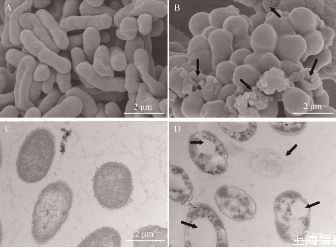 基于掃描SEM和TEM,分析GD對副溶血弧菌細(xì)胞結(jié)構(gòu)的影響。結(jié)果顯示,從掃描電鏡圖中可見,在無藥物處理?xiàng)l件下,副溶血弧菌形態(tài)飽滿均勻,外形圓潤,表面光滑平整(圖2A),而在1/4MIC濃度的GD處理后,菌體細(xì)胞發(fā)生裂解,出現(xiàn)空洞或裂縫,大量胞內(nèi)泄露物質(zhì)黏附在細(xì)胞表面(圖2B);從透射電鏡可以看出,未經(jīng)藥物處理的對照組副溶血弧菌細(xì)胞結(jié)構(gòu)完整,表面光滑,細(xì)胞內(nèi)容物分布均勻(圖2C),而GD處理組菌體細(xì)胞壁、細(xì)胞膜出現(xiàn)消融,細(xì)胞內(nèi)出現(xiàn)大空泡,細(xì)胞質(zhì)減少且分布不均(圖2D)。掃描電鏡和透射電鏡結(jié)果均表明,GD處理可破壞副溶血弧菌細(xì)胞結(jié)構(gòu)完整性,影響細(xì)胞膜通透性,導(dǎo)致大分子物質(zhì)泄露。