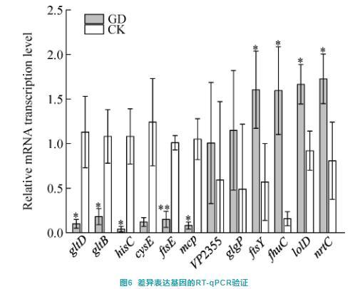 為驗(yàn)證轉(zhuǎn)錄組測序數(shù)據(jù)的準(zhǔn)確性,隨機(jī)選取6個顯著下調(diào)基因(gltD、gltB、hisC、cysE、ftsE和mcp)和6個顯著上調(diào)基因(VP2355、glgP、ftsY、fhuC、lolD和nrtC)進(jìn)行RT-qPCR驗(yàn)證試驗(yàn)。結(jié)果顯示,與對照組相比,氨基酸代謝相關(guān)基因(gltD、gltB和hisC)、膜轉(zhuǎn)運(yùn)相關(guān)基因(ftsE)以及細(xì)菌趨化性相關(guān)基因(mcp)在GD組中均顯著下調(diào)(P<0.05),此外生物膜形成相關(guān)基因(cysE)在GD組中的表達(dá)水平也低于對照組,但未達(dá)到顯著水平(P>0.05)(圖6);相反,鐵離子轉(zhuǎn)運(yùn)相關(guān)基因(ftsY、fhuC、lolD和nrtC)在GD組中顯著上調(diào)(P<0.05),此外蛋白質(zhì)輸出相關(guān)基因(VP2355和glgP)在GD組中的表達(dá)水平高于對照組,但未達(dá)到顯著水平((P>0.05)(圖6)。RT-qPCR驗(yàn)證試驗(yàn)結(jié)果與轉(zhuǎn)錄組分析結(jié)果基本一致,表明轉(zhuǎn)錄組數(shù)據(jù)分析可信度較高。