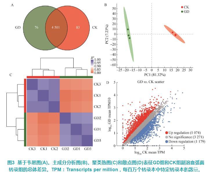 圖3基于韋恩圖(A)、主成分分析圖(B)、聚類熱圖(C)和散點(diǎn)圖(D)表征GD組和CK組副溶血弧菌轉(zhuǎn)錄組的總體差異。TPM:Transcripts per million,每百萬個轉(zhuǎn)錄本中特定轉(zhuǎn)錄本的數(shù)量。