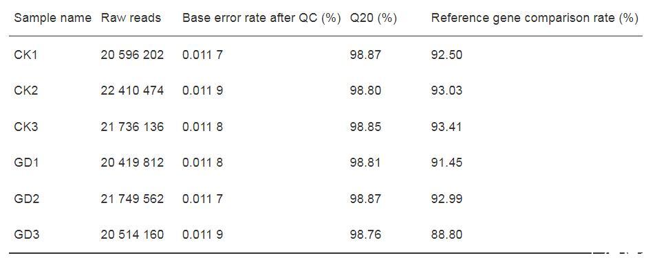 為比較GD處理組和對照組副溶血弧菌轉(zhuǎn)錄組的差異,用NovaSeq X Plus平臺進(jìn)行轉(zhuǎn)錄組測序,采用統(tǒng)計分析方法對質(zhì)控后數(shù)據(jù)進(jìn)行質(zhì)量分析。結(jié)果顯示,質(zhì)控后所有樣品均獲得2 000萬條以上Clean reads,堿基錯誤率均低于0.012 0%,質(zhì)量大于99.90%的堿基占比(Q20)均超過98.76%;將質(zhì)控后數(shù)據(jù)與參考基因組進(jìn)行比對,所有樣品的比對率均大于88.80%(表2),表明轉(zhuǎn)錄組測序質(zhì)量可靠。