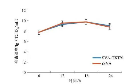 為比較拯救病毒與親本病毒的復(fù)制能力與增殖特性,繪制病毒生長曲線(圖6),發(fā)現(xiàn)兩種病毒的復(fù)制能力與增殖特性相似,無明顯差異。