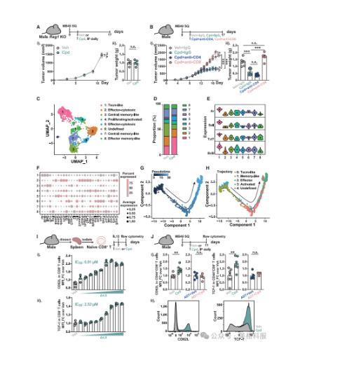 本研究深入探討了3-oxo-D4,6-LCA在抗腫瘤免疫中的作用機(jī)制,發(fā)現(xiàn)其通過(guò)AR依賴途徑促進(jìn)具有干細(xì)胞樣特性的腫瘤浸潤(rùn)性CD8+T細(xì)胞(Tscm-like)的分化與維持。實(shí)驗(yàn)表明,該BA并不直接抑制MB49腫瘤細(xì)胞生長(zhǎng),而是依賴宿主免疫系統(tǒng)發(fā)揮作用,在缺乏B/T細(xì)胞的Rag1敲除小鼠中失去了抗腫瘤效果。進(jìn)一步分析顯示,CD8+T細(xì)胞是介導(dǎo)其抗癌效應(yīng)的關(guān)鍵細(xì)胞類型。通過(guò)對(duì)腫瘤微環(huán)境中CD8+T細(xì)胞進(jìn)行單細(xì)胞RNA測(cè)序,研究人員發(fā)現(xiàn)3-oxo-D4,6-LCA顯著富集了表達(dá)Tcf7、Sell和Bcl2等干性相關(guān)基因的干細(xì)胞樣記憶T細(xì)胞亞群(cluster 1),并且這些細(xì)胞表達(dá)較高的AR水平,提示其對(duì)BA的響應(yīng)可能與AR信號(hào)通路密切相關(guān)。軌跡分析揭示,該BA可誘導(dǎo)CD8+T細(xì)胞從干細(xì)胞樣狀態(tài)向效應(yīng)細(xì)胞逐步分化。體外實(shí)驗(yàn)也證實(shí),3-oxo-D4,6-LCA以劑量依賴方式促進(jìn)初始CD8+T細(xì)胞向干細(xì)胞樣表型分化。在體內(nèi)模型中,該BA處理的小鼠腫瘤微環(huán)境中干細(xì)胞樣CD8+T細(xì)胞比例顯著增加,且這一效應(yīng)在雄激素剝奪治療(ADT)后被消除,驗(yàn)證了其AR依賴性。此外,在Pmel-1黑色素瘤模型中,該BA還增強(qiáng)了過(guò)繼轉(zhuǎn)移的腫瘤特異性CD8+T細(xì)胞的療效,并提升其干性特征。綜上,3-oxo-D4,6-LCA通過(guò)調(diào)控CD8+T細(xì)胞內(nèi)在狀態(tài),促進(jìn)抗腫瘤免疫應(yīng)答。