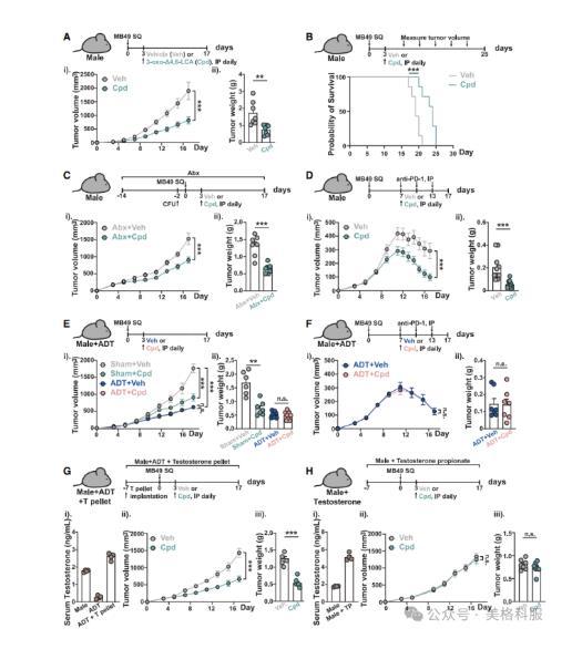 本研究評(píng)估了微生物群衍生的膽汁酸3-oxo-D4,6-LCA在體內(nèi)的抗腫瘤作用及其與免疫檢查點(diǎn)治療的協(xié)同效應(yīng)。研究發(fā)現(xiàn),該BA通過(guò)拮抗雄激素受體(AR)顯著抑制MB49荷瘤小鼠的腫瘤生長(zhǎng)和轉(zhuǎn)移,并提高整體生存率,其腫瘤抑制效果在很大程度上不依賴于腸道微生物。此外,3-oxo-D4,6-LCA還能增強(qiáng)抗PD-1免疫治療的效果。進(jìn)一步實(shí)驗(yàn)表明,在接受雄激素剝奪治療(ADT)的小鼠中,該BA的抗腫瘤及免疫增強(qiáng)作用被消除,而在補(bǔ)充生理劑量睪酮的ADT小鼠中則恢復(fù),說(shuō)明其作用機(jī)制依賴于AR信號(hào)通路。藥代動(dòng)力學(xué)分析顯示,該化合物在血清和腫瘤間質(zhì)液中的濃度分別為約8μM和9μM,且未引起明顯的肝毒性或膽汁酸譜紊亂。這些結(jié)果揭示了3-oxo-D4,6-LCA通過(guò)AR依賴機(jī)制發(fā)揮抗腫瘤和免疫調(diào)節(jié)功能。