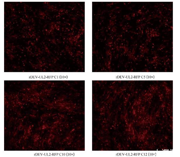圖2表達(dá)紅色熒光的重組DEV病毒