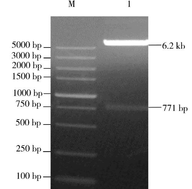 2.1重組質(zhì)粒pT-UL2-RFP的酶切鑒定重組質(zhì)粒pT-UL2-RFP用限制性內(nèi)切酶NheI-HF以及BamH I-HF雙酶切鑒定,得到大小約為6.2 kb和771 bp的兩個(gè)片段(圖1),符合理論值。