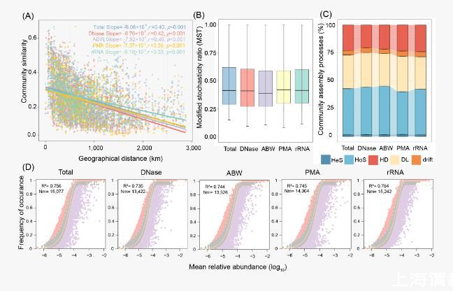 圖4.基于不同方法的原核生物群落相似性距離衰減模式和構(gòu)建機(jī)制(A)距離衰減關(guān)系;(B)基于修正隨機(jī)比(MST)的群落構(gòu)建機(jī)制;(C)基于iCAMP的群落構(gòu)建機(jī)制;以及(D)中性群落模型(NCM)的適合度。HoS:同質(zhì)選擇;HeS:異質(zhì)選擇;HD:同質(zhì)擴(kuò)散;DL:擴(kuò)散限制;Total:總DNA提?。籇Nase:DNase預(yù)消化;ABW:堿性緩沖液洗滌;PMA:疊氮溴化丙錠(PMA)處理;rRNA:rRNA直接表征。
