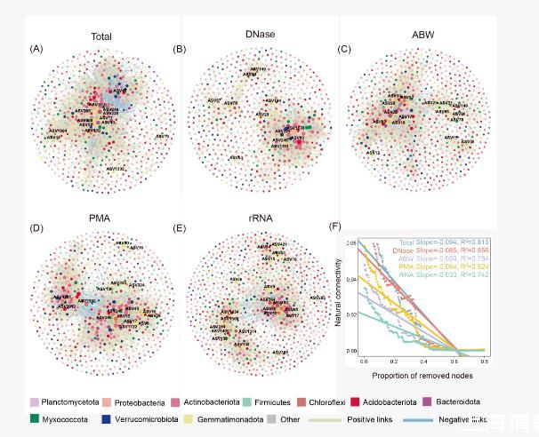 基于不同核酸提取方法的土壤原核生物群落共現(xiàn)模式;(F)基于不同核酸提取方法的網(wǎng)絡(luò)魯棒性。根據(jù)分類信息對(duì)節(jié)點(diǎn)進(jìn)行了著色,文本中的節(jié)點(diǎn)代表模塊中心點(diǎn)。網(wǎng)絡(luò)的魯棒性是根據(jù)從網(wǎng)絡(luò)中移除的節(jié)點(diǎn)比例所引起自然連通性的變化來評(píng)估的,自然連通性的下降率越高,表明網(wǎng)絡(luò)的穩(wěn)定性越低。Total:總DNA提取;DNase:DNase預(yù)消化;ABW:堿性緩沖液洗滌;PMA:疊氮溴化丙錠(PMA)處理;rRNA:rRNA直接表征。
