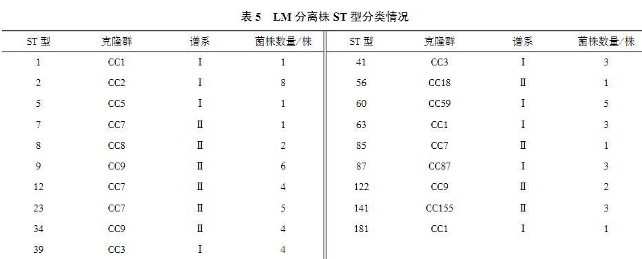分離株MLST分型:58株LM分離株的ST型分為19種(包括ST1,ST2,ST5,ST8,ST9,ST14,ST18,ST21,ST26,ST29,ST31,ST34,ST87,ST108,ST115,ST120,ST121,ST122,ST619)和11個克隆群(CC)。均屬于譜系Ⅰ(包含所有1/2b血清型)和譜系Ⅱ(包含所有1/2a和1/2c血清型)。其中ST2型最多(8株);ST9,ST34和ST122同屬于CC9克隆群,其數(shù)量最多(12株)。優(yōu)勢克隆群為CC9(12株),CC2(8株)。
