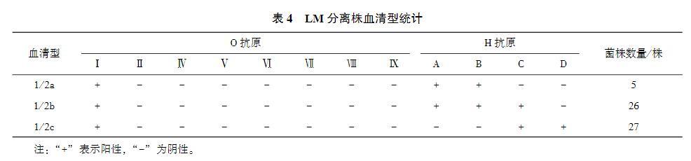 分離株血清型鑒定:58株LM分離株血清型分為3種:1/2a型5株(8.62%),1/2b型26株(44.83%),1/2c型27株(46.55%)。優(yōu)勢血清型為1/2b和1/2c。