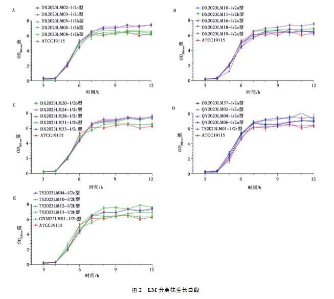 細菌生長曲線:25株被測LM分離株與參考株ATCC19115的生長曲線趨勢基本一致。在5h進入對數(shù)生長期,8h后逐漸進入平臺期。大多數(shù)被測分離株的生長能力高于參考株。