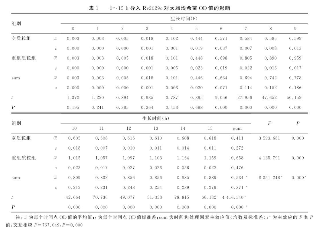 表1 0~15 h導(dǎo)入Rv2029c對(duì)大腸埃希菌OD值的影響