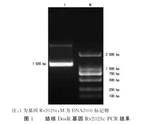 以提取的結(jié)核基因組為模板,在設(shè)計(jì)好的引物作用下,行PCR擴(kuò)增。PCR成功擴(kuò)出Rv2029c DNA,大小1 020 bp。見圖1。