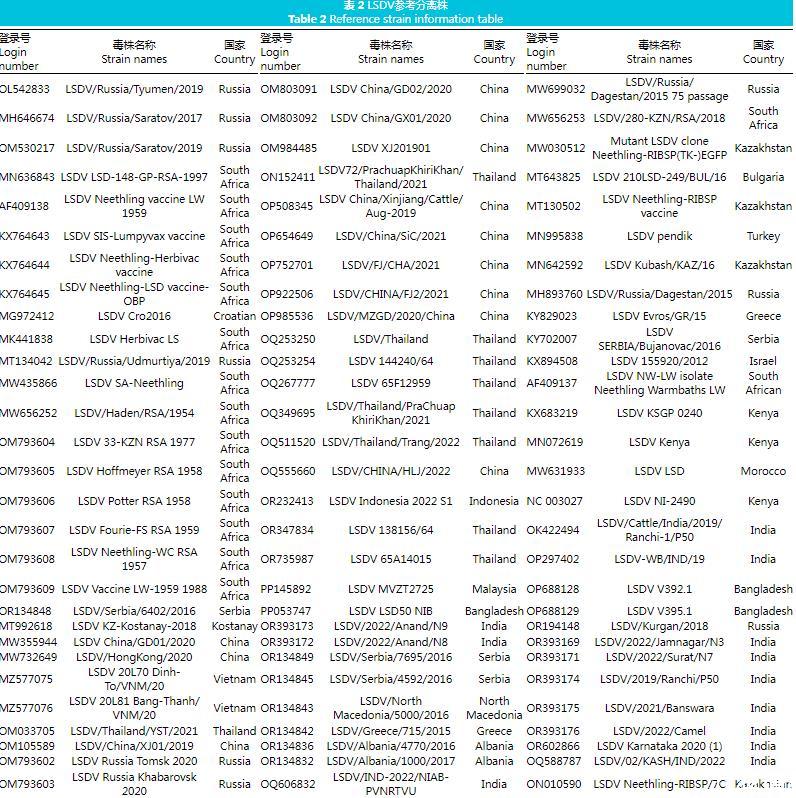 采用病毒基因組DNA/RNA提取試劑盒提取第4代細(xì)胞上清DNA,并使用引物GPCR-F/GPCR-R檢測病毒(引物序列見表1),回收目的基因,送生工生物工程(上海)股份有限公司測序。利用生物信息學(xué)軟件DNAStar7.0和MEGA6分析測得的GPCR基因序列,與其它分離毒株(見表2)使用MEGA7中的Clustal W對核苷酸進行比較比對及遺傳進化分析并使用TVBOT進行美化。核苷酸相似性比對的百分比由DNASTAR(Lasergene Inc.,Madison,USA)的MegAlign程序生成。使用MEGA 7進行系統(tǒng)發(fā)育分析,并使用最適合數(shù)據(jù)集的模型構(gòu)建最大似然樹。系統(tǒng)發(fā)育關(guān)系的可靠性評價采用bootstrap分析與1 000個重復(fù)。