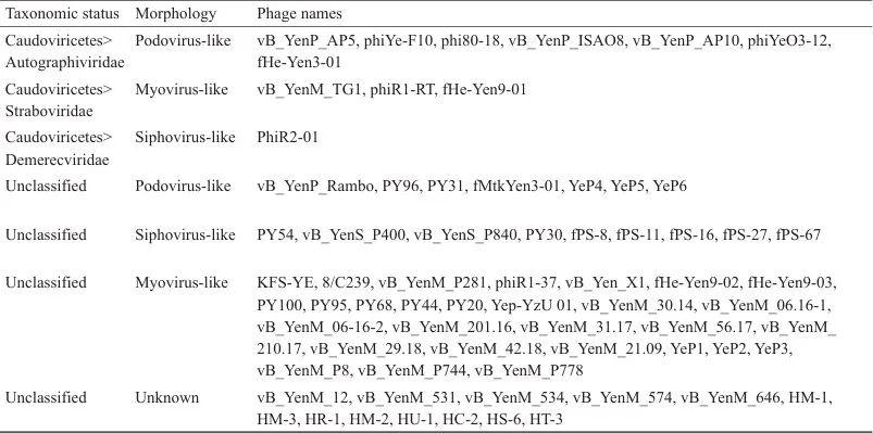 截至目前,公共數(shù)據(jù)庫和文獻(xiàn)中共公布了67株小腸結(jié)腸炎耶爾森氏菌噬菌體(表3),其中在國際病毒分類委員會(ICTV)的分類系統(tǒng)中有分類地位的有11株:分別屬于有尾綱Caudoviricetes的Autographiviridae科(7株)、Straboviridae科(3株)和Demerecviridae科(1株)。其他未分類的56株小腸結(jié)腸炎耶爾森氏菌噬菌體中,9株呈長尾病毒樣(Siphovirus-like)形態(tài),7株呈短尾病毒樣(Podovirus-like)形態(tài),29株呈肌尾病毒樣(Myovirus-like)形態(tài),11株形態(tài)未知。基因組最大的是262 391 bp(Yersinia phage phiR1-37),最小的是34 966 bp(Yersinia phage YeP6)。
