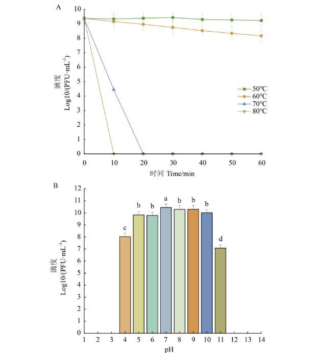 本試驗測試了噬菌體DK-13在50℃、60℃、70℃和80℃的條件下,1 h之內(nèi)的活性情況。結(jié)果如圖3-A所示,在50℃和60℃時,噬菌體的活性幾乎不發(fā)生變化;70℃下噬菌體活性下降,20 min后完全失活;溫度升高至80℃,噬菌體10 min后完全失活。結(jié)果表明噬菌體DK-13受溫度影響較小。