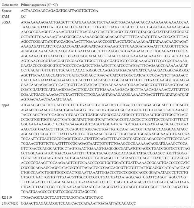 植酸酶appA基因(Uniprot ID:P07102)克隆自大腸桿菌K12,錨定蛋白pGSA基因(ACT52837.1)采用全基因合成(合成基因的載體骨架為pET-30a),錨定蛋白和植酸酶的融合可參考文獻,融合后的載體為pET-30a-pGSA-appA。其中,錨定蛋白pGSA和乘客蛋白AppA之間需用柔性肽(GGGGSGGGGS)連接,以消除pGSA和AppA之間的干擾,融合后的表面展示蛋白命名為pGSA-appA。大腸桿菌(Escherichia coli)DH5α和一株從黑土中分離的菌株皮氏羅爾斯頓氏菌(Ralstonia pickettii)G3分別作為基因的克隆和表達宿主,質(zhì)粒轉(zhuǎn)化通過二氨基庚二酸(diaminopimelic acid,DAP)營養(yǎng)缺陷型的大腸桿菌(Escherichia coli)WM3064作為供體菌進行偶聯(lián)轉(zhuǎn)移實現(xiàn)。INTEGRATE系統(tǒng)所用載體pSPIN骨架的構(gòu)建步驟可參考文獻。其中,CRISPR間隔區(qū)的Spacer序列(32 nt)用于基因的靶向定位,R end和L end之間的區(qū)域為Cargo區(qū)(其中包含目的基因)。具體基因和引物序列見表1。