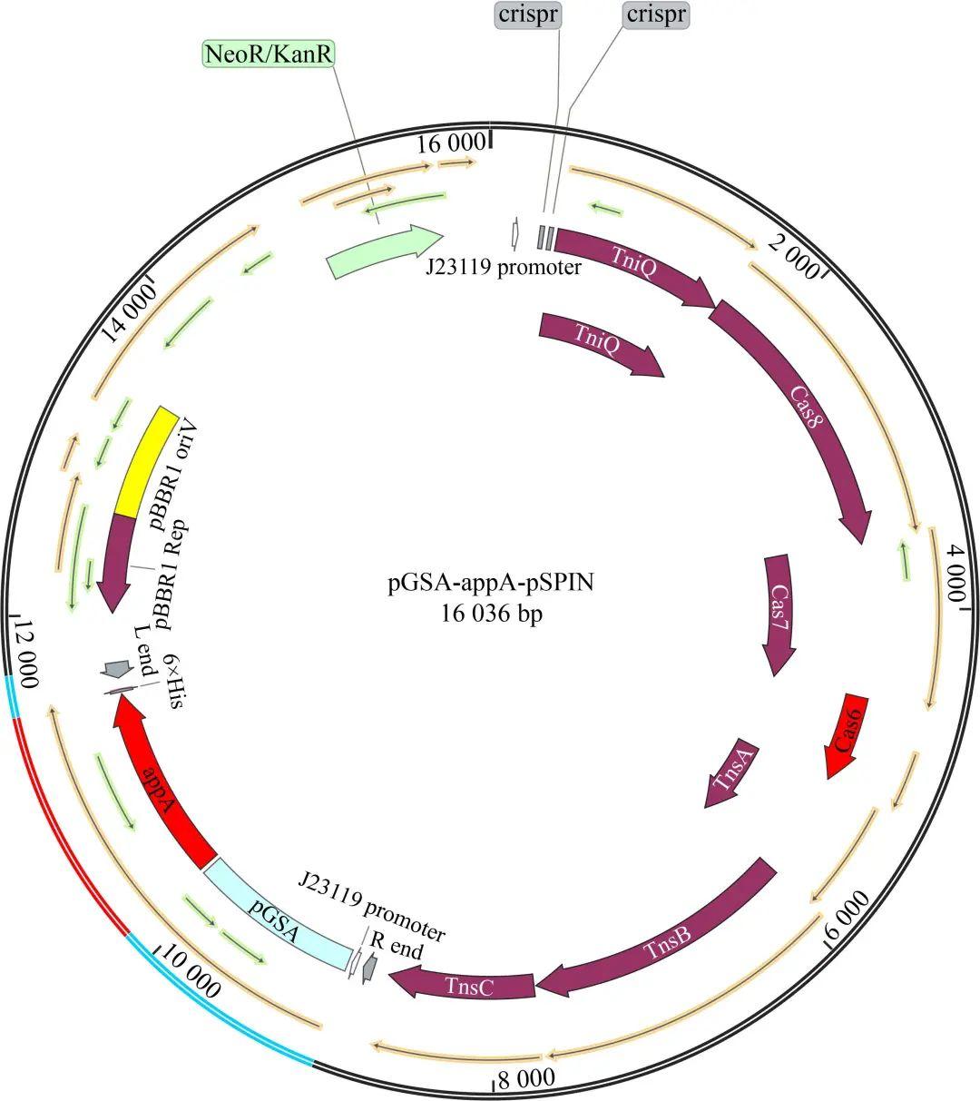 本研究使用的最終表達載體可參考圖1中的pGSA-appA-pSPIN,該載體主要由QCascade(CRISPR區(qū)、Cas基因表達區(qū))、TnsABC(轉(zhuǎn)座酶表達區(qū))和Donor(Cargo區(qū))3部分組成。載體構(gòu)建的步驟包括Spacer區(qū)改造、啟動子改造和Cargo區(qū)改造,其中植酸酶融合蛋白的啟動子為J23119組成型啟動子。利用SnapGene軟件構(gòu)建載體圖譜,引物設計和無縫克隆模擬也通過該軟件完成。載體的構(gòu)建步驟主要包括載體線性化和無縫連接,詳細步驟參考文獻。