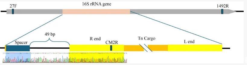 目前,已報道的CRISPR引導(dǎo)轉(zhuǎn)座研究中均缺乏通用的基因轉(zhuǎn)座位點(diǎn)。許多細(xì)菌基因是單拷貝基因,并且由于環(huán)境中的細(xì)菌通常為營養(yǎng)缺陷型,許多細(xì)菌并不一定擁有已報道的轉(zhuǎn)座靶位點(diǎn),例如LacZ基因,這無疑限制了INTEGRATE等CRISPR轉(zhuǎn)座技術(shù)的應(yīng)用。本研究基于CRISPR引導(dǎo)的轉(zhuǎn)座插入技術(shù),創(chuàng)造性地將目標(biāo)菌的16S rRNA基因位點(diǎn)作為靶點(diǎn),進(jìn)行快速基因修飾。16S rRNA基因位點(diǎn)作為轉(zhuǎn)座靶點(diǎn),一方面省去了復(fù)雜的安全位點(diǎn)篩選,同時由于其為多拷貝基因,因此在基因組中部分16S rRNA基因位點(diǎn)的轉(zhuǎn)座并不會對轉(zhuǎn)基因菌的生長造成影響。此外,通過實(shí)驗證明,功能基因可以快速完成靶向轉(zhuǎn)座,其位置可以通過Spacer序列進(jìn)行精確定位。此外,細(xì)胞分裂基因也是微生物所共有的基因之一,同樣可以作為基因修飾的候選靶點(diǎn)。