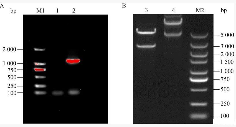 ▲圖3轉(zhuǎn)座插入(A)和pGSA-appA載體構(gòu)建(B)的PCR凝膠圖譜。M1:DL2000 DNA marker;泳道1:土著菌;泳道2:基因修飾菌;3:pGSA-appA酶切驗證;4:pET-30a-pGSA的載體克隆驗證;M2:DL5000 DNA marker。
