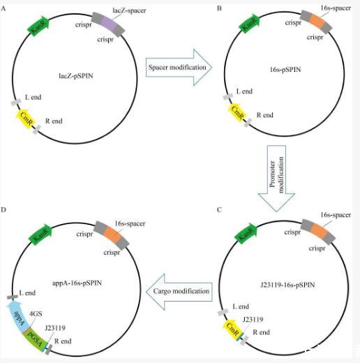 為了實(shí)現(xiàn)pGSA-appA基因在目標(biāo)細(xì)菌基因組中16S rRNA基因位點(diǎn)的靶向修飾,需要對原始pSPIN載體骨架進(jìn)行逐步改造。原始pSPIN的Spacer引導(dǎo)序列靶向定位于lacZ基因(圖2A)。第一步,將原始Spacer序列改造為針對目標(biāo)菌株的16s-spacer(該序列引導(dǎo)整個轉(zhuǎn)座復(fù)合體對靶點(diǎn)的識別),見圖2B。第二步,以16s-pSPIN為基礎(chǔ),對Cargo轉(zhuǎn)座子的啟動子進(jìn)行改造。原始載體的Cargo基因缺少啟動子,因此采用組成型啟動子J23119,以實(shí)現(xiàn)目的基因的穩(wěn)定表達(dá),改造后得到質(zhì)粒J23119-16s-pSPIN(圖2C)。隨后,在J23119-16s-pSPIN質(zhì)?;A(chǔ)上對Cargo轉(zhuǎn)座子區(qū)域進(jìn)行改造,將pGSA-AppA融合蛋白基因酶切(圖3B)并連接在J23119啟動子后10 bp左右處,構(gòu)建最終的植酸酶AppA表面展示系統(tǒng)載體,使其能夠在16S rRNA基因位點(diǎn)上表達(dá)(圖2D)。