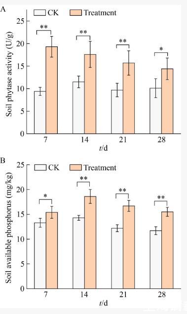 ▲圖6土壤植酸酶活性和有效磷含量變化。A:土壤植酸酶活性對比;B:土壤速效磷含量對比。