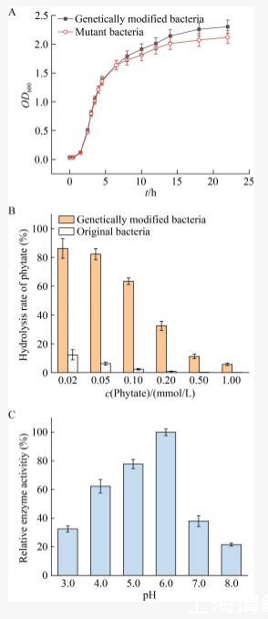 ▲圖5基因修飾菌的生長趨勢對比及對植酸的水解。A:生長曲線對比;B:不同底物濃度的水解率;C:pH對植酸酶活性的影響。