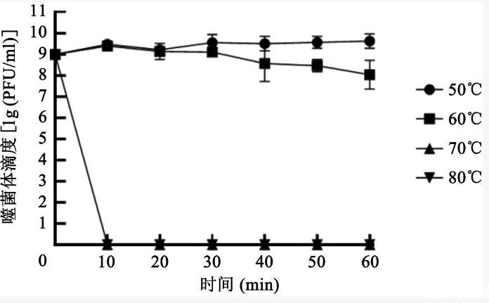 (1)噬菌體熱穩(wěn)定性:噬菌體JD01在50℃時,保持較好的活性,在暴露于60℃60 min時,噬菌體活性下降了一個數(shù)量級。70℃時,在10 min內(nèi)急劇下降直至失活,結(jié)果表明噬菌體JD01對高溫敏感(圖4)。