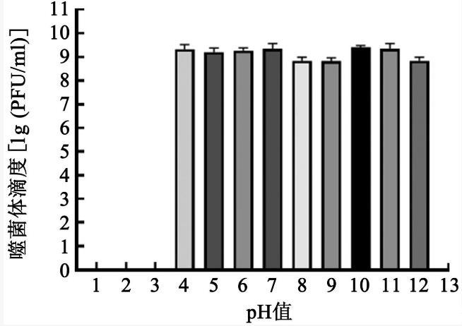 (2)噬菌體pH穩(wěn)定性:結(jié)果如圖5所示,噬菌體JD01在pH4.0~12.0條件下仍保持原來較高的滴度,在pH<4.0或pH>12.0的條件下完全失活。