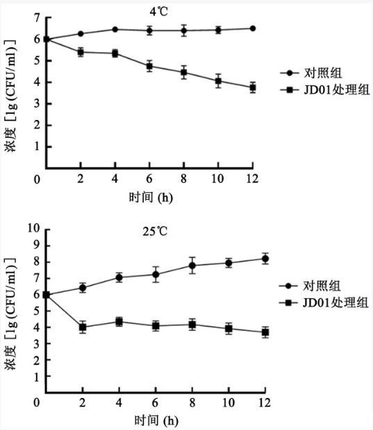 如圖11所示,4℃條件下噬菌體JD01處理組細菌濃度在2 h內下降了約0.8 lg(CFU/ml),作用12 h后,細菌的濃度降低了約2.5 lg(CFU/ml),殺菌效果明顯;25℃下,2 h之內下降了約2.2 lg(CFU/ml),作用12 h下降了約4.5 lg(CFU/ml);提示噬菌體JD01在25℃條件下對污染蛋液的殺菌效果優(yōu)于4℃。