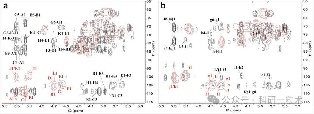 圖3.(a)L01-B1的二維NMR譜圖。(b)L01-B102-I的二維NMR譜圖。疊加了HSQC(紅色)和HMBC(黑色)譜圖。(A:T-α-Araf;B:1,5-α-Araf;C:1,3,5-α-Araf;D/d:T-β-Galp;E/e:1,3-β-Galp;F/f:1,3,6-β-Galp;G/g:1,6-β-Galp;H/h:1,4-β-Galp;I/i:1,4-α-GalpA;J/j:1,2-α-Rhap;K/k:1,2,4-α-Rhap;L/l:T-β-GlcpA)