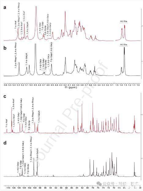 圖2.(a)L01-B1的1H NMR譜圖。(b)L01-B102-I的1H NMR譜圖。(c)L01-B1的13C NMR譜圖。(d)L01-B102-I的13C NMR譜圖。(a)和(b)展示了L01-B1中各種糖苷鍵對應(yīng)的異頭質(zhì)子的化學(xué)位移,而(c)和(d)則顯示了異頭碳和與1,6-β-Galp殘基相關(guān)的C-6特征共振信號。