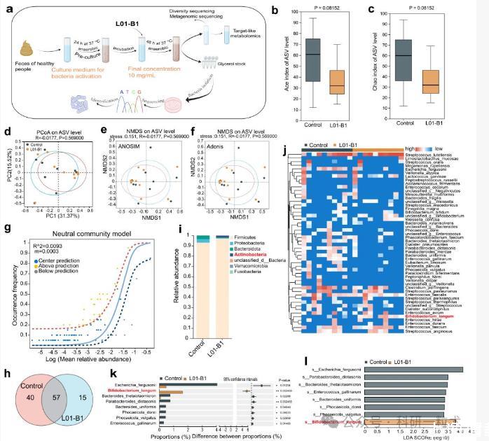 圖5.基于16S rRNA基因的多樣性測(cè)序顯示,L01-B1可改變?nèi)祟惸c道微生物群的組成。(a)體外實(shí)驗(yàn)的示意圖。(b)ASV水平上的α多樣性分析,Ace指數(shù)。(c)ASV水平上的α多樣性分析,Chao指數(shù)。箱線圖顯示了最小值、最大值、中心、箱體邊界、須狀線以及百分位數(shù)。(d)ASV水平上的主坐標(biāo)分析(PCoA)。(e)ASV水平上的非度量多維標(biāo)度(NMDS)分析。(f)ASV水平上的NMDS分析。(g)中性群落模型(NCM)分析。(h)物種水平上的韋恩圖分析。(i)柱狀圖顯示的門水平上腸道微生物群的組成分析。(j)熱圖顯示的物種水平上腸道微生物群的組成分析。(k)對(duì)照組和L01-B1組在物種水平上的比較。(l)物種水平上的LEfSe分析。