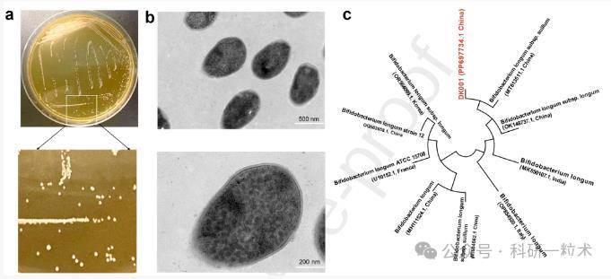 為了進(jìn)一步探討這一現(xiàn)象,我們嘗試從人糞便中分離出長(zhǎng)雙歧桿菌。正如預(yù)期,菌落在37°C無氧培養(yǎng)箱中培養(yǎng)48小時(shí)后在mMRS平板上生長(zhǎng)良好(圖7a)。16S rRNA測(cè)序及比對(duì)結(jié)果顯示,分離出的菌株為長(zhǎng)雙歧桿菌亞種sueorum,并命名為DK001(圖S11)。生化鑒定表明,DK001能夠發(fā)酵棉子糖、乳糖、D-核糖和淀粉,但不能發(fā)酵葡萄糖酸、三梨醇、纖維二糖、山梨醇或D-阿拉伯糖(表S6)。透射電子顯微鏡(TEM)結(jié)果顯示,該菌株無莢膜,呈卵圓形(圖7b)。系統(tǒng)發(fā)育樹分析顯示,DK001與從中國(guó)分離的長(zhǎng)雙歧桿菌亞種sueorum具有較高的同源性(圖7c)。因此,本研究成功分離并鑒定了長(zhǎng)雙歧桿菌的一個(gè)亞種。