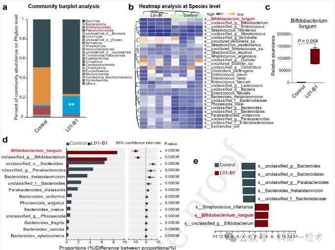 圖6.宏基因組測(cè)序顯示,L01-B1增加了長(zhǎng)雙歧桿菌的豐度。(a)在門水平上分析了人類腸道微生物群的組成。(b)在物種水平上分析了人類腸道微生物群的組成。(c)分析了長(zhǎng)雙歧桿菌的相對(duì)豐度。(d)兩組在物種水平上的比較。(e)物種水平上的LEfSe分析。數(shù)據(jù)代表技術(shù)重復(fù)三次(n=4)。對(duì)于兩組之間的比較,采用非配對(duì)雙尾學(xué)生t檢驗(yàn)。